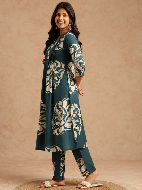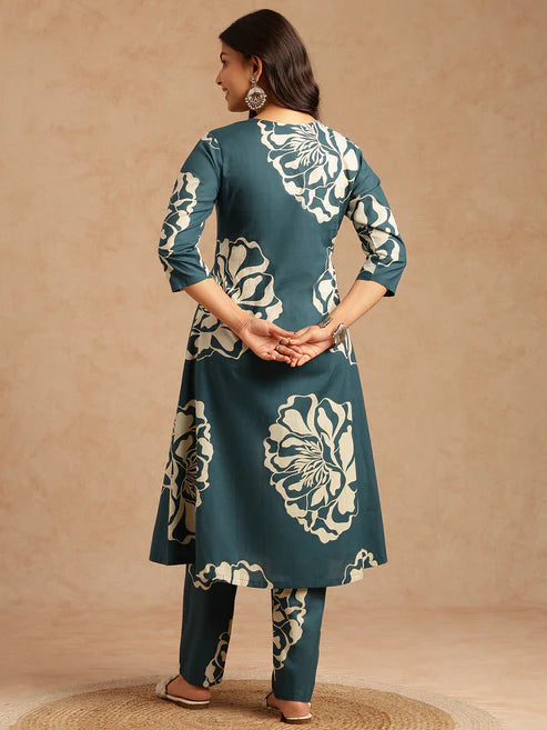 A-Line Teal Floral Printed Cotton Stitched Kurta Set