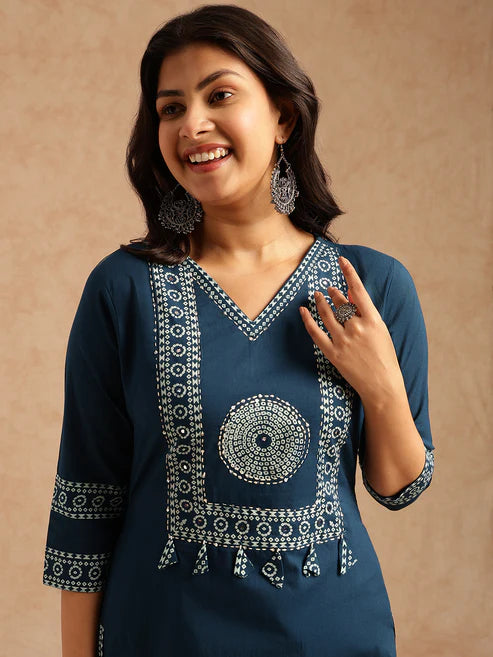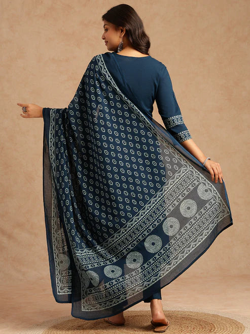 This Blue Bandhani Print Straight Cotton Kurta Set combines traditional artistry with breathable, lightweight cotton for year-round comfort. The straight cut offers a timeless silhouette that flatters various body types...
