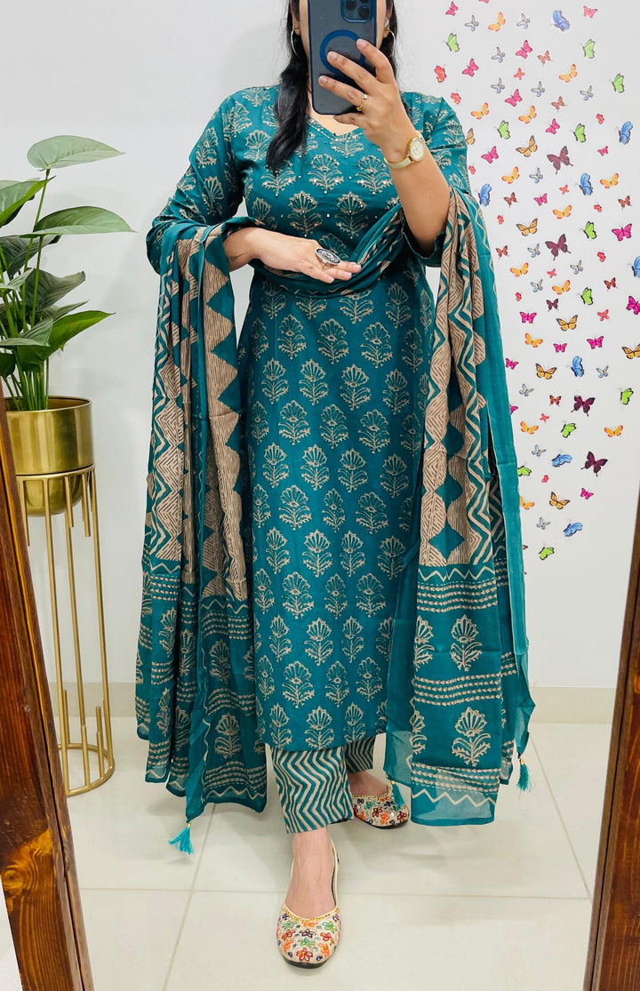 This Designer Suit showcases a refined Mughal and Kalamkari fusion through Azrak Bagru print on premium fine cotton. The kurti features expertly handcrafted detailing on the yoke, highlighting skilled artisanal craftsmanship. Paired with tailored pants and a fine cotton dupatta adorned with tasteful tassels, this set strikes a balance between traditional artistry and comfortable wearability. Ideal for those who appreciate timeless elegance combined with meticulous design and quality fabric.