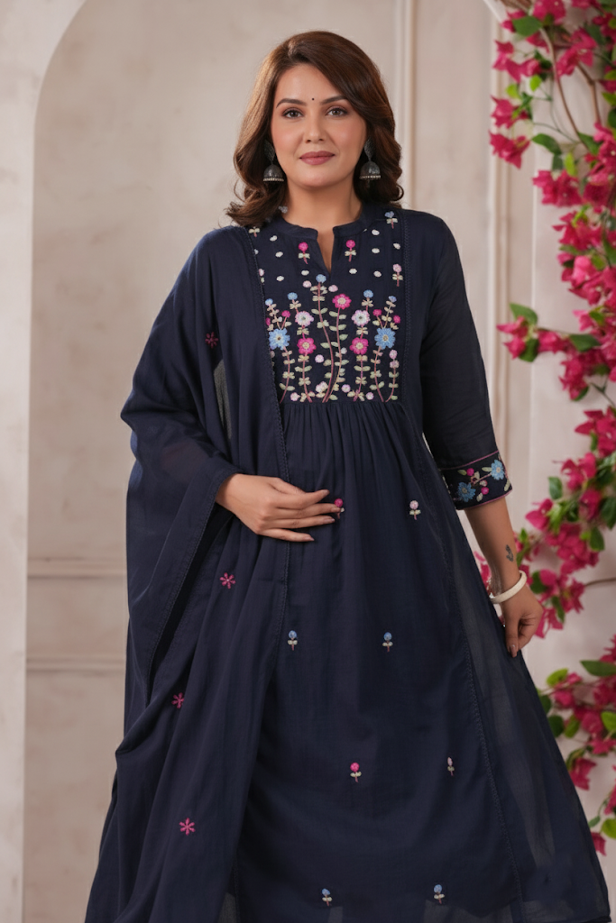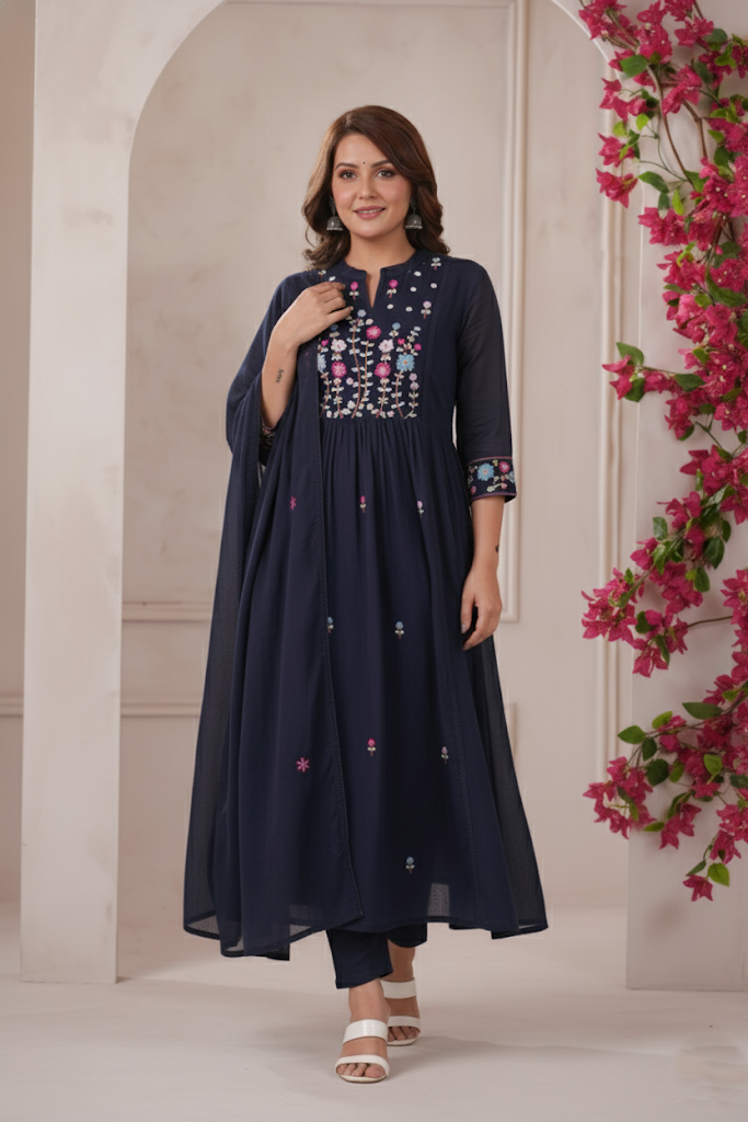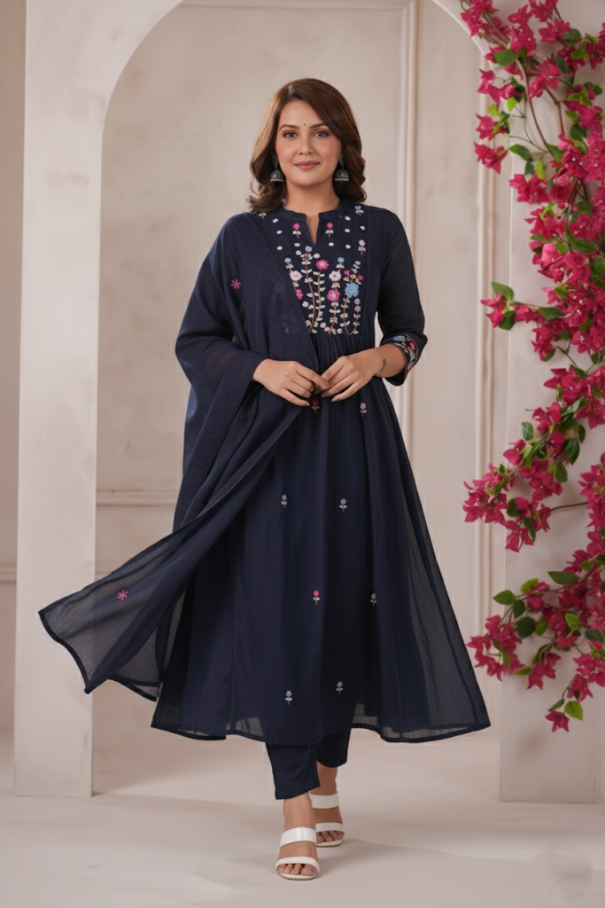 Navy Blue Traditional Outfit with Floral Embroidery