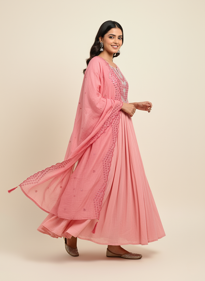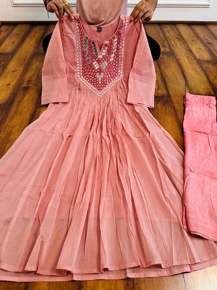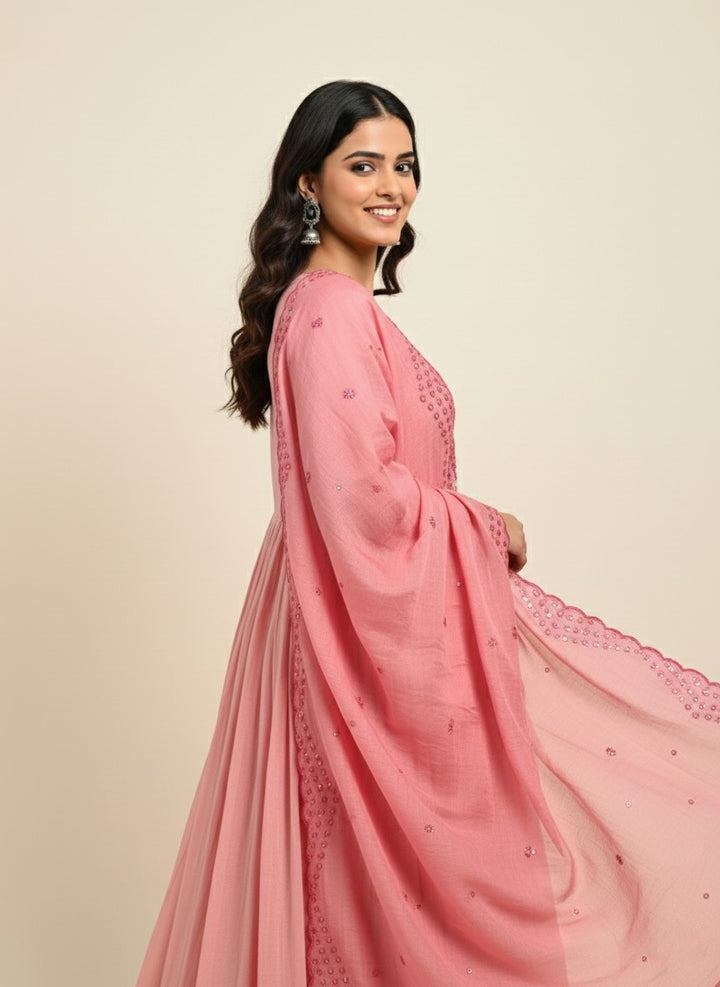 Pink Chanderi Silk Mirror Work Anarkali Suit