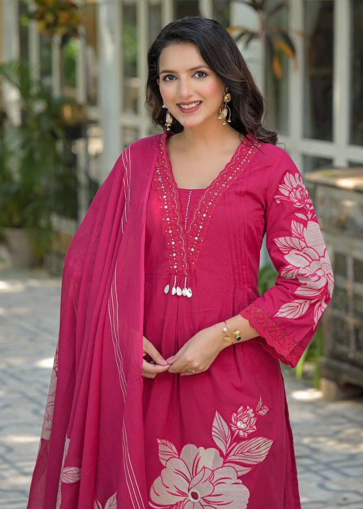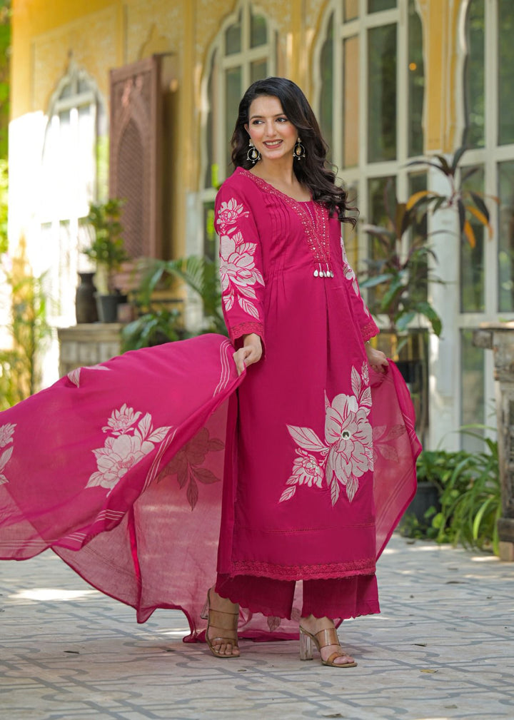 • Product type: Kurta Set• Colour: Rani Pink• Fabric: Cotton• Style: A-Line Anarkali• Pattern: Floral Print• Neck: V-neck• Sleeve : 3/4 Sleeve• Occasion: Festive Wear• In Box : 1 Kurta...