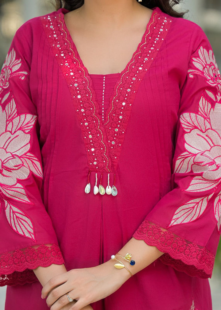 Rani Pink Cotton Kurta Palazzo Set with Large Floral Design
